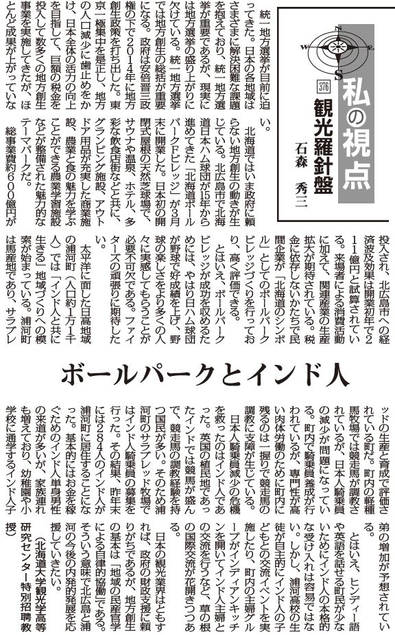 【私の視点 観光羅針盤 376】 ボールパークとインド人 石森秀三