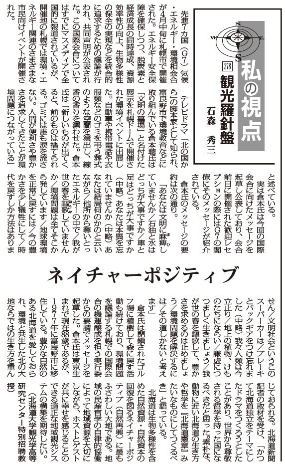 【私の視点 観光羅針盤 378】 ネイチャーポジティブ 石森秀三