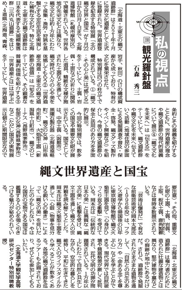 「北海道・北東北の縄文遺跡群」は権力者のために造られた壮麗な建造物とは異なり、竪穴建物や墓などの痕跡が地中にあるだけだ。されど、遺跡群で発掘されたさまざまな遺物を通して、「自然との共生のあり方」や「命ある全てを尊ぶ心」などを学ぶことができる。現代世界では自然破壊や貧富格差が厳しく批判され、近代文明の功罪が問題視されている。1万年以上にわたって自然と共生しながら、安定的な暮らしを維持し、平和に生きてきた縄文人のライフスタイルから学べることが数多くある。各地の縄文遺跡群を巡るツアーも企画されており、ぜひとも参加してもらいたい。
