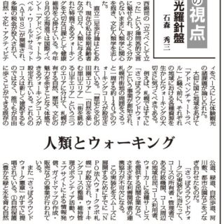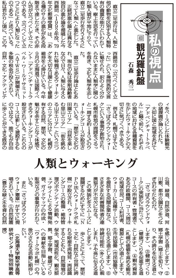 直立二足歩行論はともあれ、現在の私は後期高齢者なので日々、人類に与えられた特質であるウォーキングを大切な日課として健康維持を心掛けている。今年9月の北海道では国際イベント「アドベンチャートラベル・ワールドサミット(ATWS)」が開催され、多額の税金が投入されて、自然・文化・アクティビティをベースにした体験観光の諸課題が論じられた。