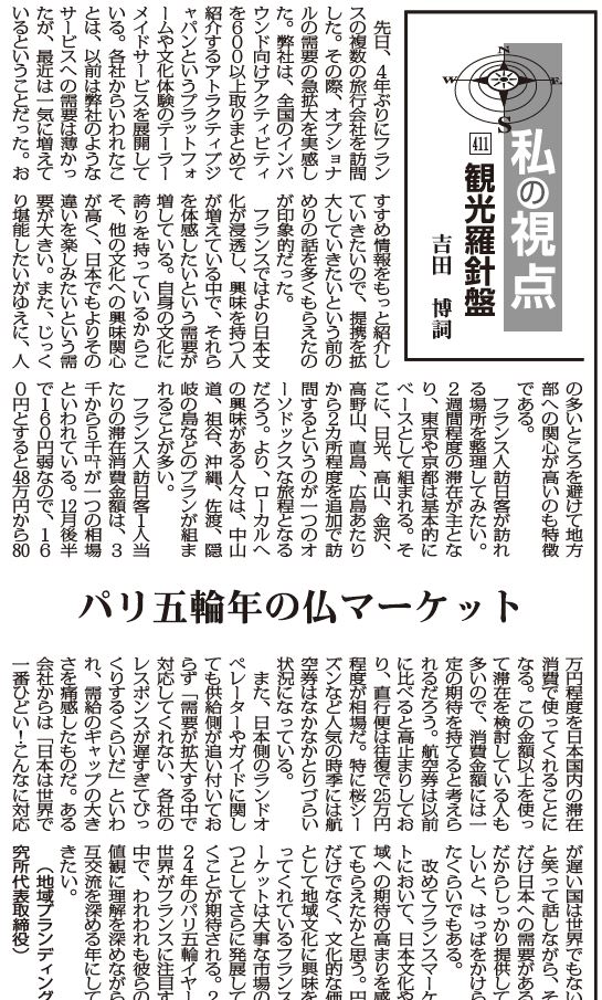 改めてフランスマーケットにおいて、日本文化や地域への期待の高まりを感じてもらえたかと思う。円安だけでなく、文化的な価値として地域文化に興味を持ってくれているフランスマーケットは大事な市場の一つとしてさらに発展していくことが期待される。2024年のパリ五輪イヤーで世界がフランスに注目する中で、われわれも彼らの価値観に理解を深めながら相互交流を深める年にしていきたい。