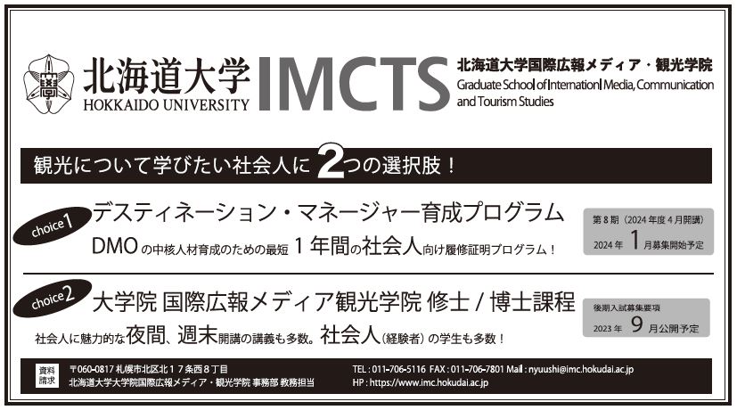 北海道大学(札幌市)は2007年4月に国立大学初の観光分野の大学院として国際広報メディア・観光学院を設置。これまでに15期661人の修士課程修了者と77人の博士号取得者を輩出している。
