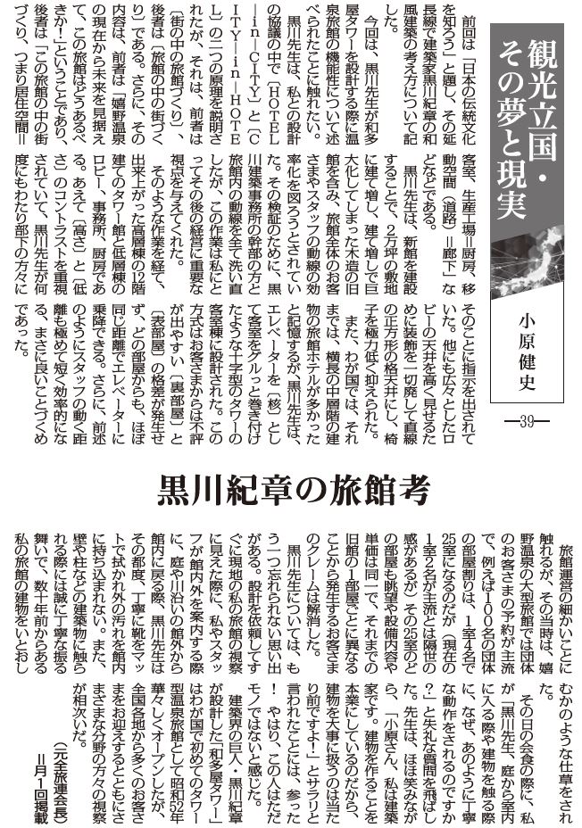 今回は、黒川先生が和多屋タワーを設計する際に温泉旅館の機能性について述べられたことに触れたい。