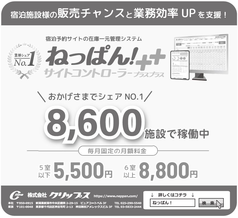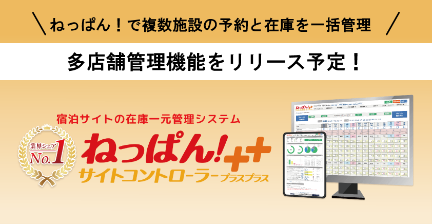 業界でトップシェアというクラウド型のサイトコントローラー「ねっぱん!サイトコントローラー++(プラスプラス)」などのクリップス。その同社ではこのほど、複数施設の予約、在庫を1画面でまとめて管理ができる「多店舗管理機能」を12月にリリースすると発表した。