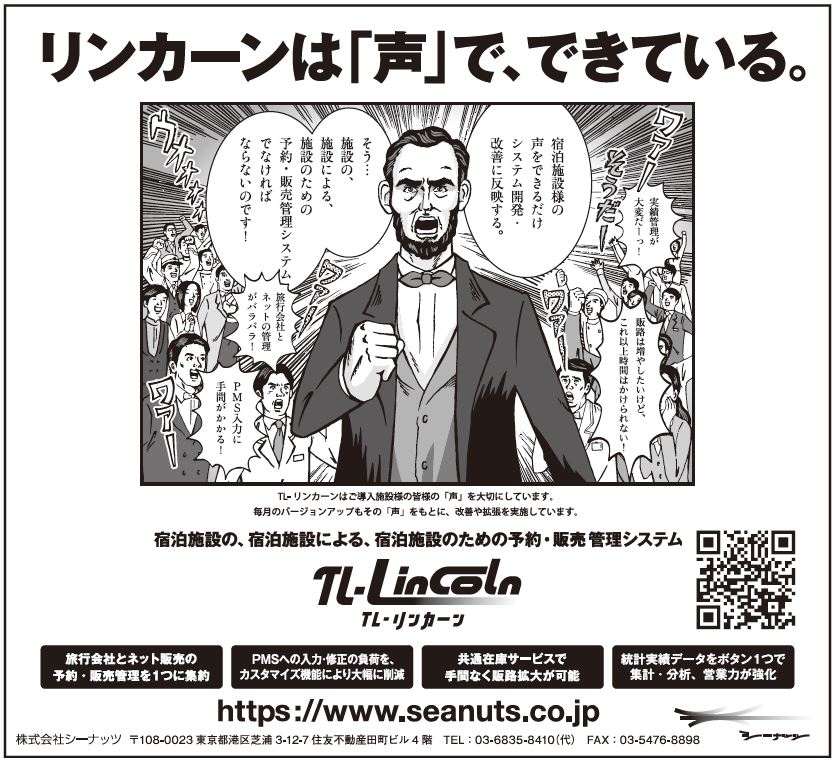 シーナッツが提供しているTL―リンカーンは、旅行会社とOTAからの通知を一元管理し、残室・料金調整が一括でできるもの。導入施設は約5100軒で、対応販売先は旅行会社、OTAを合わせて141社。導入後のフォロー・サポート体制の充実と、ユーザーの声を商品、サービスに反映する点が評価されている。