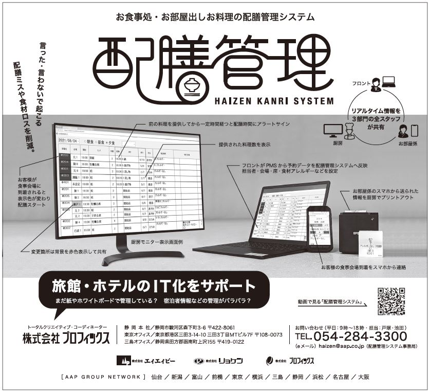 その中で、エイエイピーグループのプロフィックスは、食事に関する膨大な情報を整理、一元化する「配膳管理システム」を提供している。特徴は、リアルタイム情報を全スタッフが共有するため、配膳ミスや食材のロスを削減できる点にある。具体的には(1)メイン画面ですべての料理内容を管理できるため、どの料理がどこの部屋(どの席)の料理か迷うことがない(2)「宿泊者がいつ到着したか」「食事時間は何時か」など宿泊者の「今」の状況をその場で食事処、厨房などと共有可能―など。また、PMSとのデータ連動も簡単にできる。