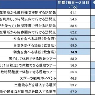旅ナカで必要とする情報は、旅の序盤から行程が進むにつれ、変化するのでしょうか。序盤は、まず「旅行先での生活を整えること」、中盤は「短時間の体験」、終盤は「土産物の購入場所」情報を探すことがわかりました。調査結果をみると(表3)