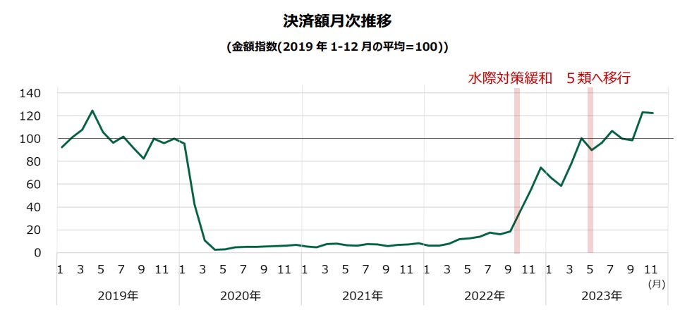 訪日外国人による決済額は、2022年10月の水際対策緩和後に急回復し、2023年の後半にコロナ禍前の2019年の水準に回復しました。2023年は新型コロナウイルスの5類移行や円安による追い風、さらに8月に中国政府による日本への団体旅行解禁といったイベントもあり、引き続き決済金額が伸長しています。