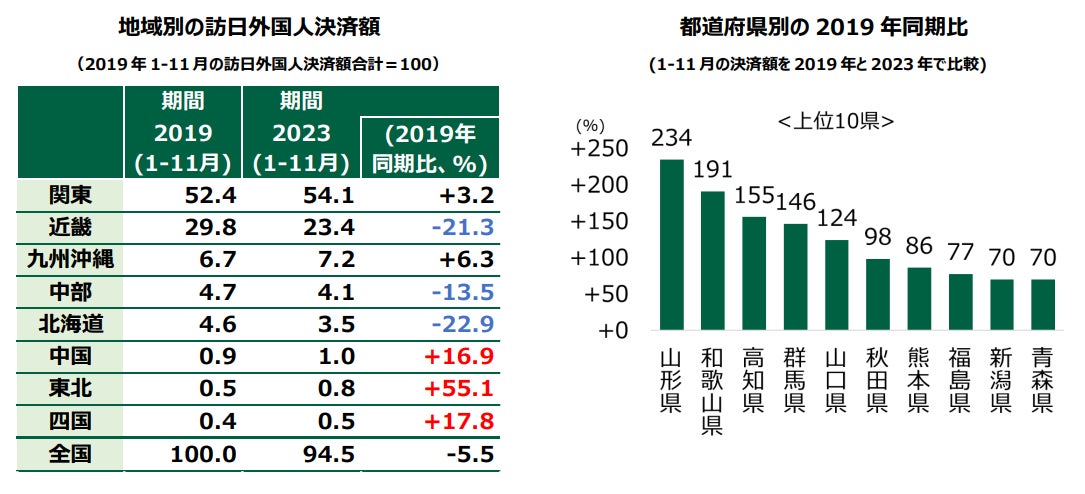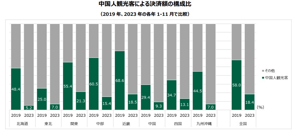 コロナ禍前と比較すると、中国人観光客による決済額の構成比は全国的に縮小しています。地域別にみると、コロナ禍前の東北地方における構成比は他地域より低く、近畿地方は比較的高い水準となっています。東北地方の2023年1-11月における決済額は、2019年同期比で55%増とコロナ禍前の水準を大きく上回っていますが、中国人観光客の決済額の構成比は、各地域の回復率に影響を与える要因の一つと考えられます。