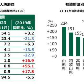 2019年と比較すると、百貨店や家電量販店などの業種で決済金額が減少しています。一方、ホテル・旅館や飲食店・レストランといった観光で利用される業種の決済額が伸長しています。コロナ禍前に注目を集めていた「爆買い」などのキーワードに代表されるモノ消費から、コト消費へと訪日外国人の需要がシフトしてきているとみられます。