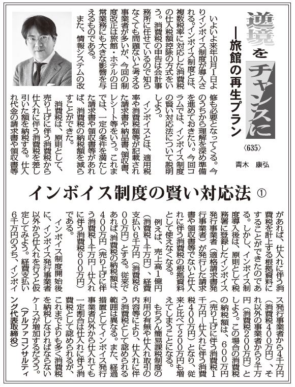 いよいよ来年10月1日よりインボイス制度が導入される。インボイス制度とは、複数税率に対応した消費税の仕入税額控除の方式をいう。消費税の申告は会計事務所に任せているので知らなくても問題ないと考える事業者が多いが、今回の制度改正は旅館・ホテルの日常業務にも大きな影響を与えるものである。
