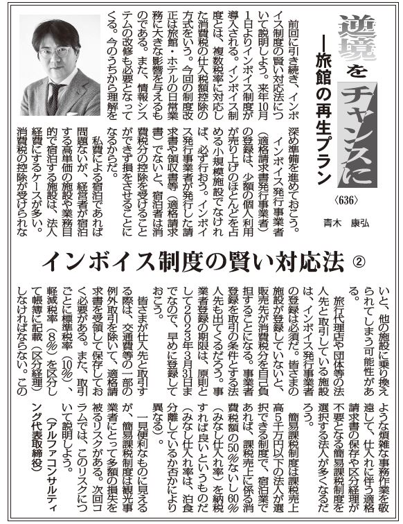 前回に引き続き、インボイス制度の賢い対応法について説明しよう。来年10月1日よりインボイス制度が導入される。インボイス制度とは、複数税率に対応した消費税の仕入税額控除の方式をいう。今回の制度改正は旅館・ホテルの日常業務に大きな影響を与えるものである。また、情報システムの改修も必要となってくる。今のうちから理解を深め準備を進めておこう。