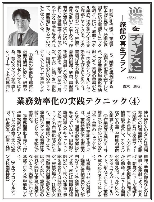 【逆境をチャンスにー旅館の再生プラン 668】業務効率化の実践テクニック〈4〉 青木康弘