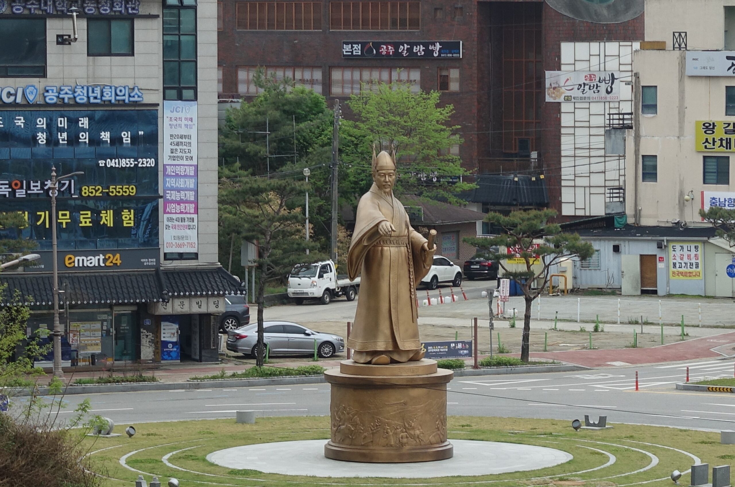 次は、ここも世界遺産である公山城(こんさんそん)を訪ねた。高句麗に追われ、都を現在のソウルから公州に移して造営したのがこの公山城。周囲に城壁をめぐらした王城で、1時間ほどで歩いて回れる。公山城前のロータリーには巨大な武寧王像が睥睨(へいげい)している。歩き疲れた向きには公州の栗を使ったスイーツや菓子を扱うカフェが立ち並び、一息入れることができる。