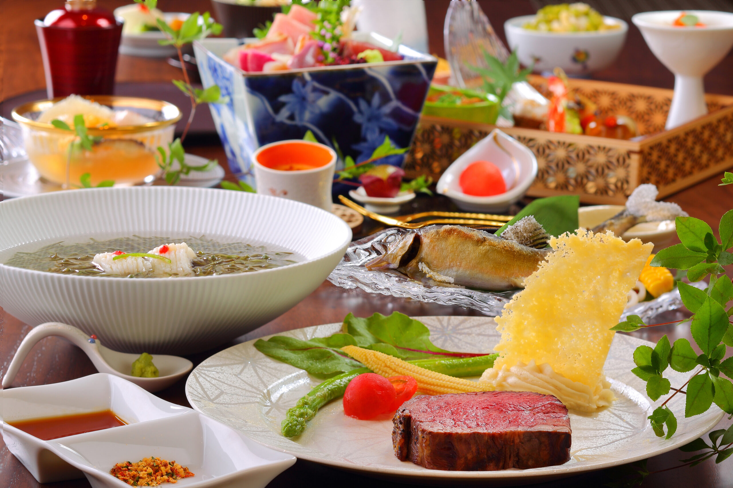 食事は種類が豊富なブッフェがオススメ。夕食は和洋中約100種、朝食は和洋約60種の料理を提供。オープンキッチンでは目の前で焼きたてのステーキや天ぷらなどを調理する。焼きたての石窯ピッツァ、美と健康にこだわったベジタブルコーナー、豊富なデザートコーナーも女性に好評だ。プランにより個室料亭、ダイニングでの会席料理も選べる。