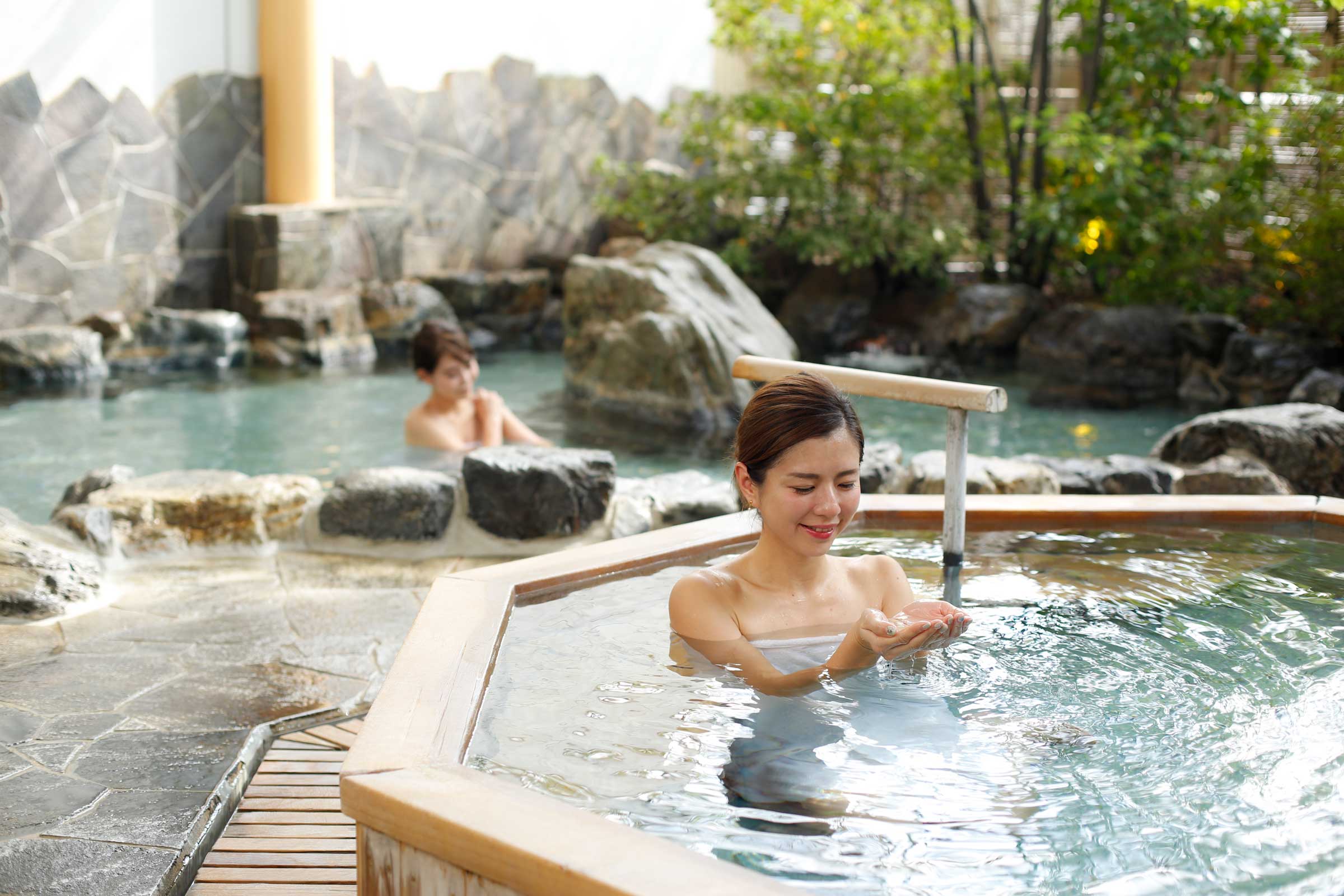 開放的で快適な湯処の魅力がパワーアップし、釜、瓶、小判、檜(ひのき)、石切、岩、八角檜、寝風呂の八つの趣の異なる湯浴みが楽しめる。みかんボールの湯、まんがの湯、足湯、手湯のほか、贅沢(ぜいたく)なプライベートタイムが過ごせる貸切露天風呂(檜、桶、陶器、石)は大人気。