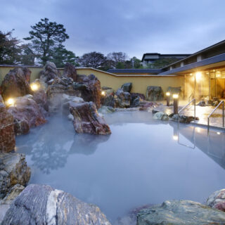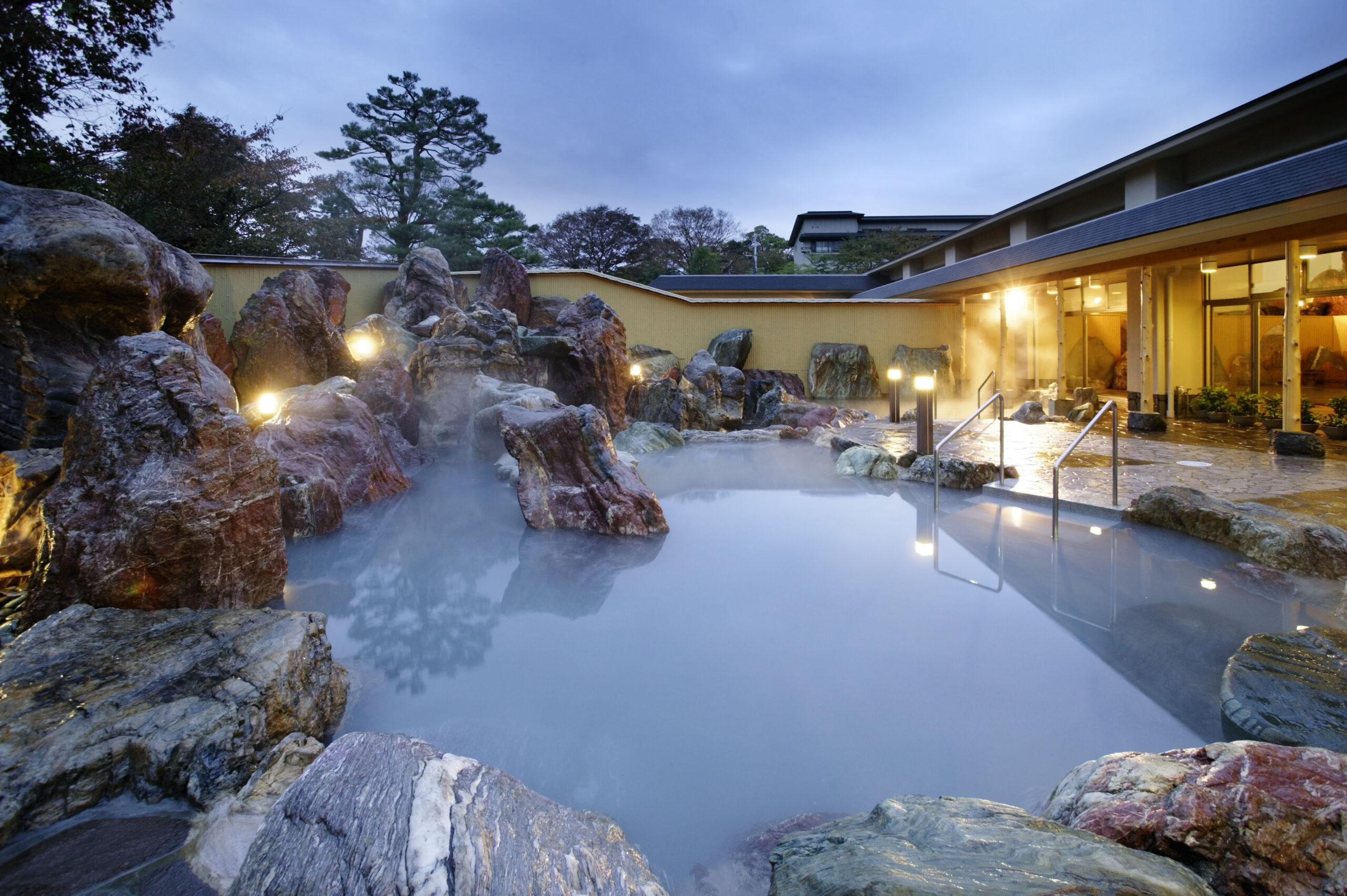 広さ300坪の大浴場「壁画大浴殿」は、文化勲章受章者、浅蔵五十吉氏が手掛けた九谷焼陶板の壁画を浴室一面に展示。「カルナの館」には、全国から集めた銘石、奇石を使った「立山連峰パノラマ大浴殿」や「庭園大露天風呂」がある。