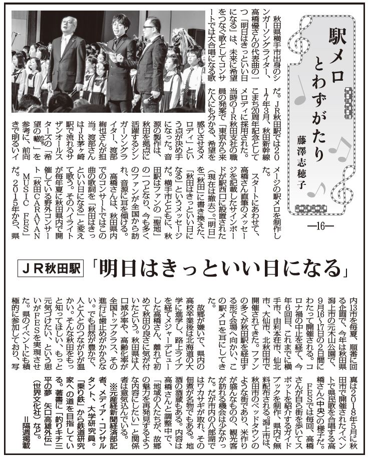 秋田県横手市出身のシンガーソングライター、高橋優さんの代表曲の一つ「明日はきっといい日になる」は、未来に希望をつなぐ歌としてコンサートでは大合唱になる歌だ。JR秋田駅では2017年3月、秋田新幹線こまち20周年記念としてメロディに採用された。当時のJR秋田支社の職員の発案で「東京から来た人にも分かる、希望を感じさせるメロディ」という点が決め手になった。音源の製作は、秋田を拠点に活躍するシンガーソングライター、渡部絢也さんが担当。渡部さんはJR茅ヶ崎駅で流れるサザンオールスターズの「希望の轍(わだち)」を参考に、前向きで明るいイメージの駅メロを制作した。