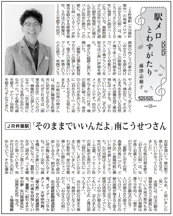 JR杵築駅(大分県杵築市)の発車メロディ「おかえりの唄」は、南こうせつさんが2019年に発表した曲がベースになっている。星野哲郎さんが50年以上も前に遺した詞を再発見した南さんが改めて作曲し、アルバムに収めた歌だ。この歌に、地元のケーブルテレビ局(CATV)が杵築市を紹介する映像を制作、5分ほどの映像は、110人を超す市民が、画面の向こうの誰かに「おかえり」を語り掛けている。この映像はコロナ禍で多くの共感を呼び、CATV対象のコンテストで準グランプリを取るほど高い評価を得た。