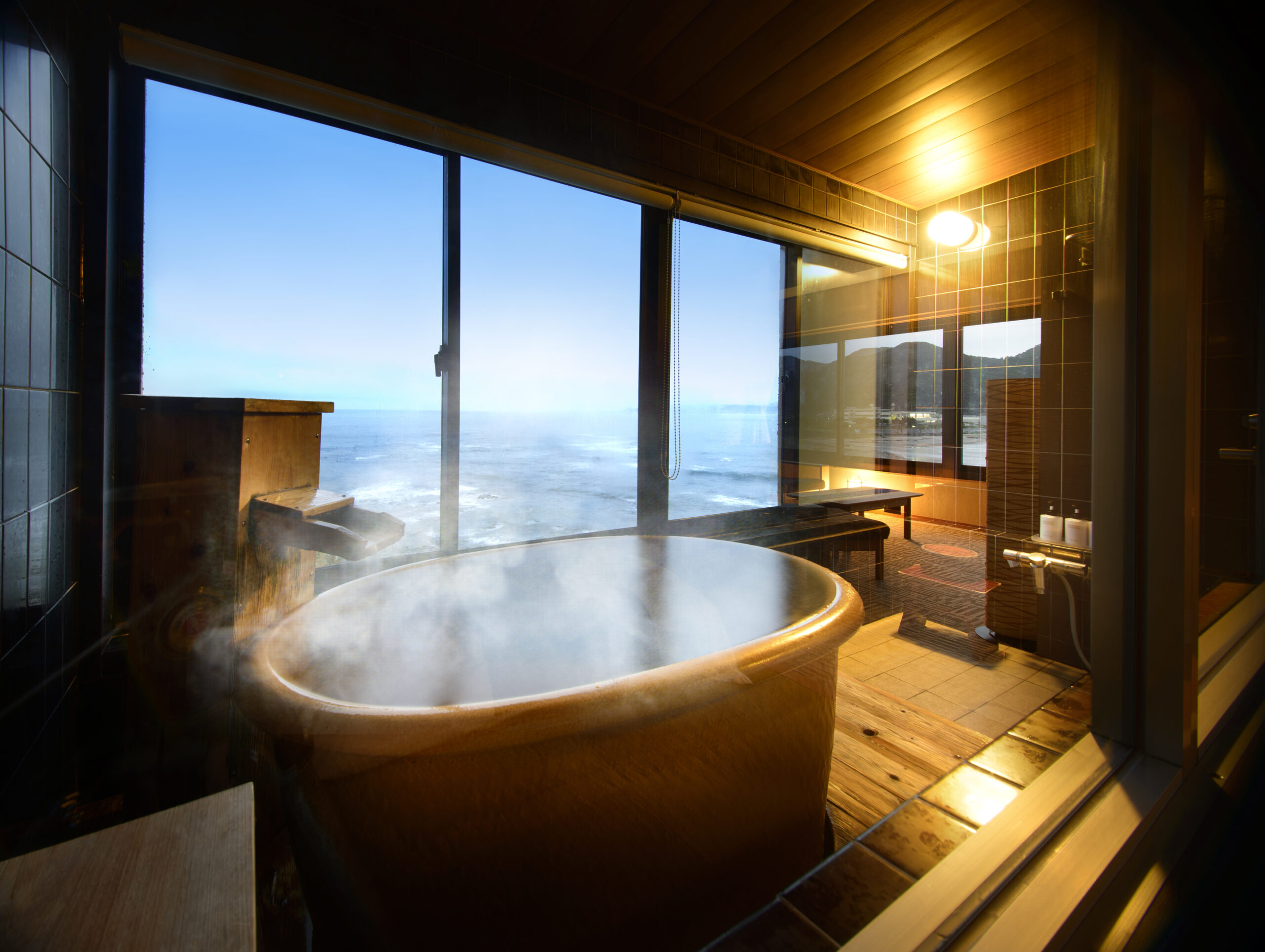宿中屋の客室は、露天風呂付きを含めて計34室。全ての客室から海と水平線のパノラマを眺められる。温泉は、自家源泉100%の天然温泉で、露天風呂や大浴場、露天風呂付き客室で堪能できる。pH8・7とアルカリ成分が高く、「美人の湯」といわれる。