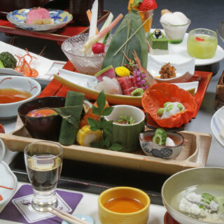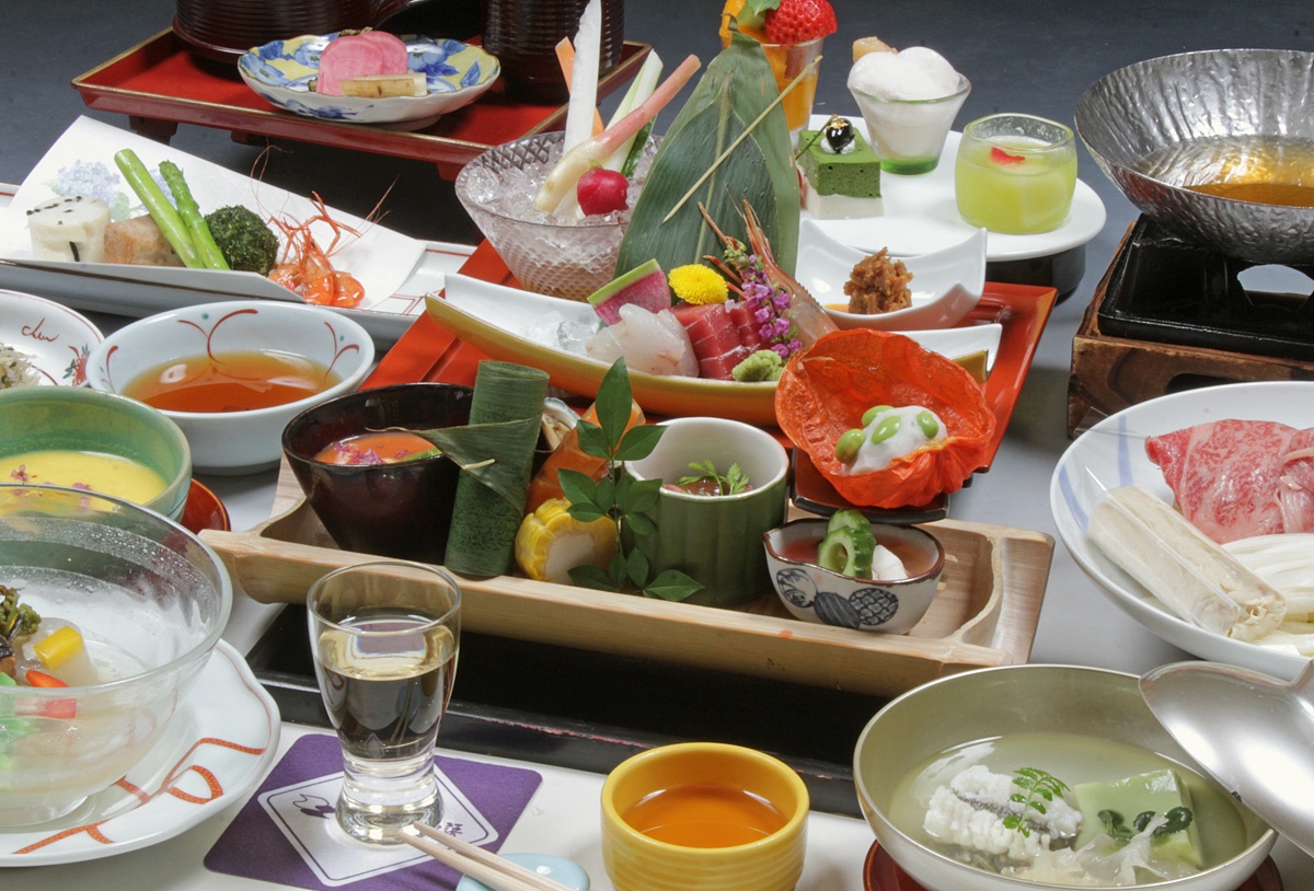 料理自慢の同館。夕食の月替わり懐石料理「千姫御膳」は、旬の食材を丁寧に選び、手作りにこだわったオリジナル懐石料理だ。名産の「日光湯波」や地産の野菜を使い、季節感を大切にした献立。中でも総料理長が精魂こめた特製出汁(だし)で頂く「千姫風しゃぶしゃぶ」は好評で、「出汁まで全部飲んでしまいました」というお客さまも多いとのこと。県産のブランド牛「とちぎ和牛」など、さらに吟味された食材を存分にあしらった「特選懐石膳」も好評で、宿泊が「グレードアッププラン」の場合に提供される。夕食後に1階「くらぶ九重」で開催されるピアノの生演奏が、宿泊客の思い出に彩りを加える。