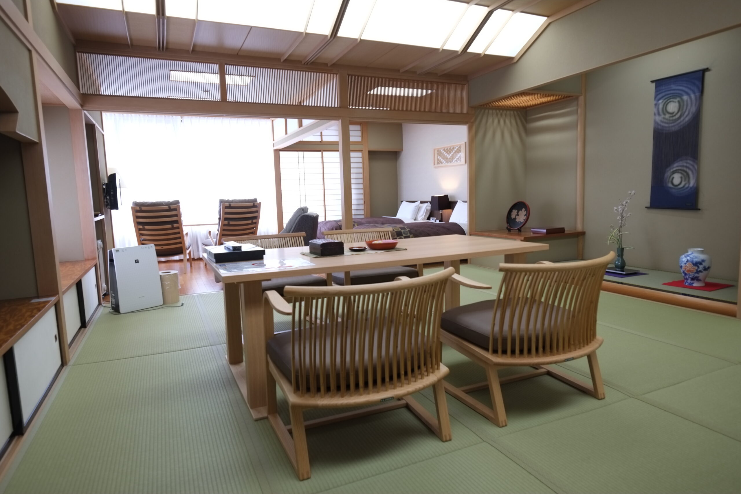 リニューアルされた特別室では、窓際に腰掛けながら日光の山々と大谷川のパノラマを、時を忘れて楽しめる。室内に用意されたテーブルやイスでゆったり過ごせる。同時期に半露天風呂付き和室の一部を半露天風呂付き和風ツインへと新装。客室は12畳から15畳へと広がり、ツインベッドを設置し、室内シャワーブースも新装するなど、一般客室もさらに上質なものとなった。