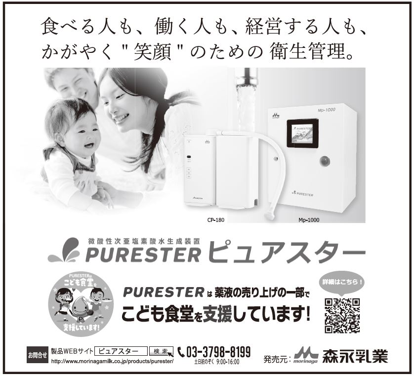 乳製品をはじめとした食品の老舗メーカー、森永乳業(東京都港区)は、微酸性次亜塩素酸水生成装置「ピュアスター」の導入を奨励している。ピュアスターは、同社が自社工場内の衛生レベル管理の維持向上を目的に開発。1997年から社外に販売を開始し、宿泊施設をはじめ、飲食店、スーパー、介護施設、食品工場などに広く導入されている。