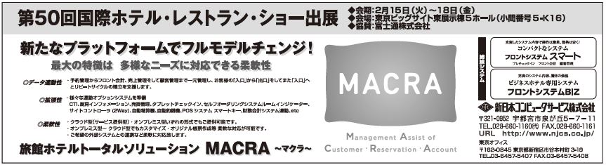 今回の国際ホテル・レストラン・ショーでは、従来の基幹システムを大幅に刷新した新システム「MACRA(マクラ)」を初公開。小規模施設向け「フロントシステムスマート」、宿泊特化型ホテル向け「フロントシステムBIZ」、各種のオプションシステムも公開する。ブースは開放的な設計にし、来場者にこれら機能を気軽に体感してもらう。