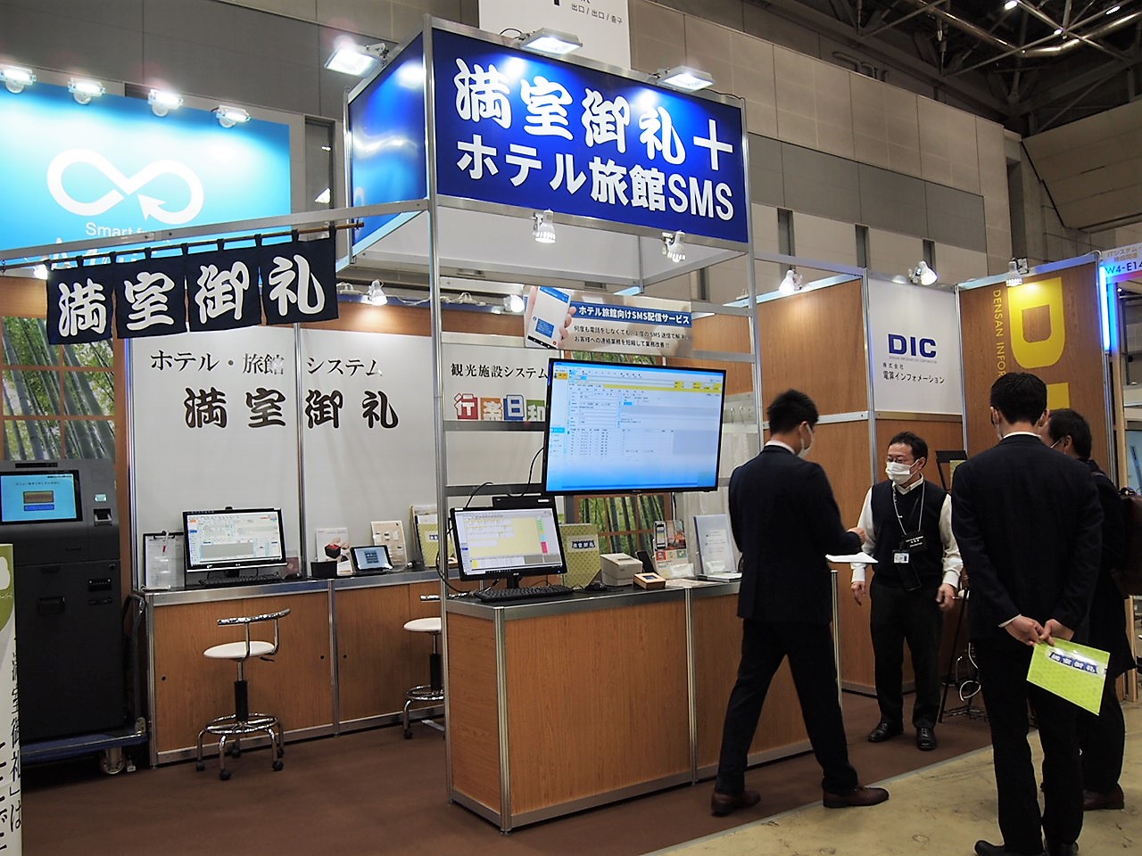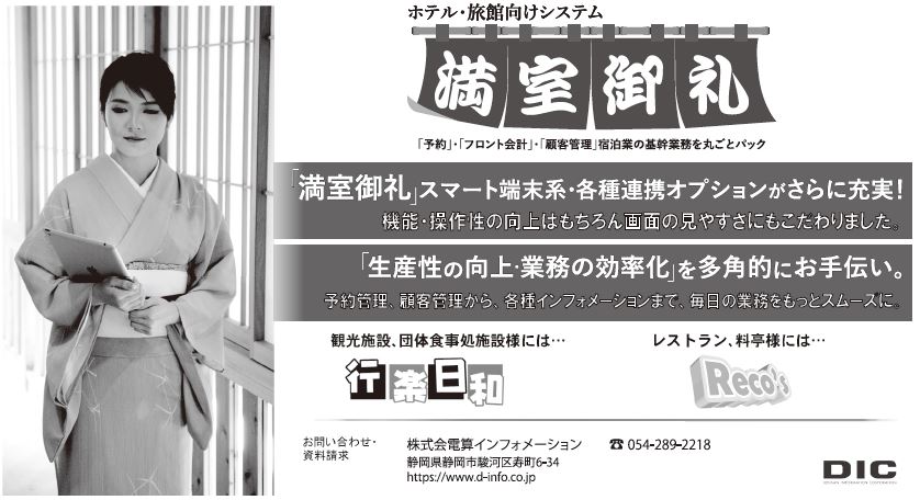 宿泊施設の基幹業務システム「満室御礼」などの電算インフォメーション。今回のテーマは、「つながるホテル・旅館システムへ」。展示内容は満室御礼と、観光施設・ドライブイン向けシステムの「行楽日和」に加え、他社製品との連動も紹介する。