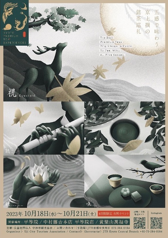 京都府の宇治市観光協会は10月18~21日、4日間限定の文化体験イベント「KYOTO PREMIUM TEA EXPERIENCES」を開催する=写真はチラシ。高級茶葉の産地として知られる宇治で、お茶を通して最上級の有形・無形文化を五感で体験できるよう、特別拝観や食事、呈茶などを組み合わせて提供する。