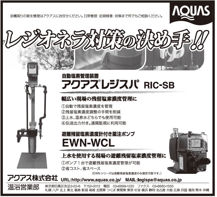 レジオネラ属菌対策に詳しい水処理メーカーのアクアスはこのほど、遊離残留塩素濃度を計測できる薬注ポンプ「EWN―WCL」の提案を旅館・ホテルに開始した。コントローラを内蔵し、自動的に各種の水質管理を行うポンプで、「特に温浴施設では、残留塩素の濃度管理に適している」とアクアス。