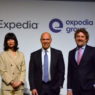 エクスペディアは20日、旅行の最適な時期などを提案する新機能とカスタマーサポート強化の発表会見を東京八重洲のブルガリホテル東京で開いた。ピーター・カーンCEOとジョン・ギーゼルマンブランド統括、同社日本法人の木村奈津子代表取締役が登壇し、トークセッション形式で新機能の説明が行われた。