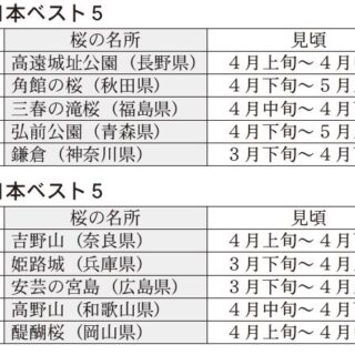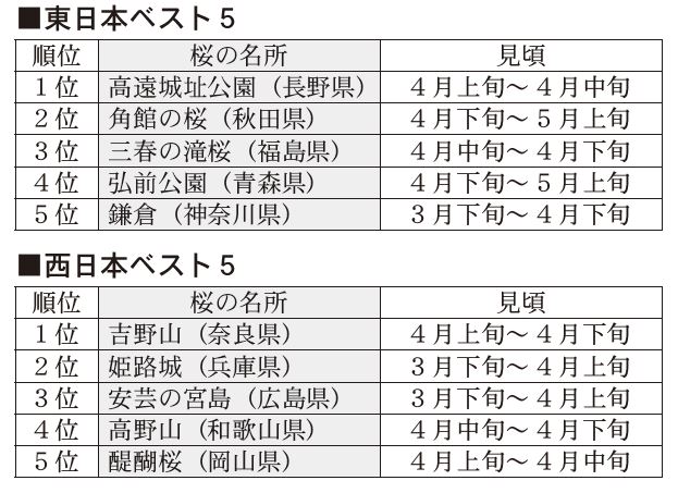 東日本の1位は長野県の「高遠城址公園」。昨年、園内の飲食制限が4年ぶりに解除され、約11万人が訪れたという。同社は最上級バス「ロイヤルクルーザー四季の華」で行くツアーや、夜間ライトアップの鑑賞ツアーなどを企画している。2位は秋田県の「角館の桜」、3位は福島県の「三春の滝桜」で東北勢が上位を占めている。