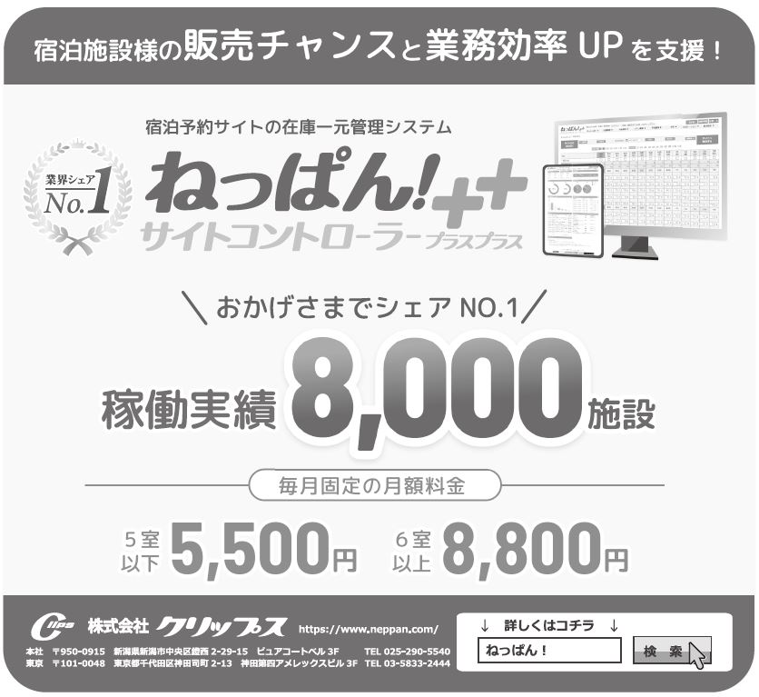 また、「ねっぱん!WEB販売支援サービス」の契約施設数もサービスの提供開始から2年で千件を超えた。この機能は、ねっぱん!++のオプションサービスで、ウェブ販売に関わる一連の業務をすべてクリップスが代行。宿泊施設の売り上げ最大化を支援する。具体的には各OTAの部屋タイプ、プランの作成、延長、企画やセールなどの案内、エントリー作業などが対象。「宿泊施設は作業コストを大幅に削減でき、サービス業務に専念できる。併せて、ウェブ担当者の採用抑制、教育コストの削減にもつながる」と同社。