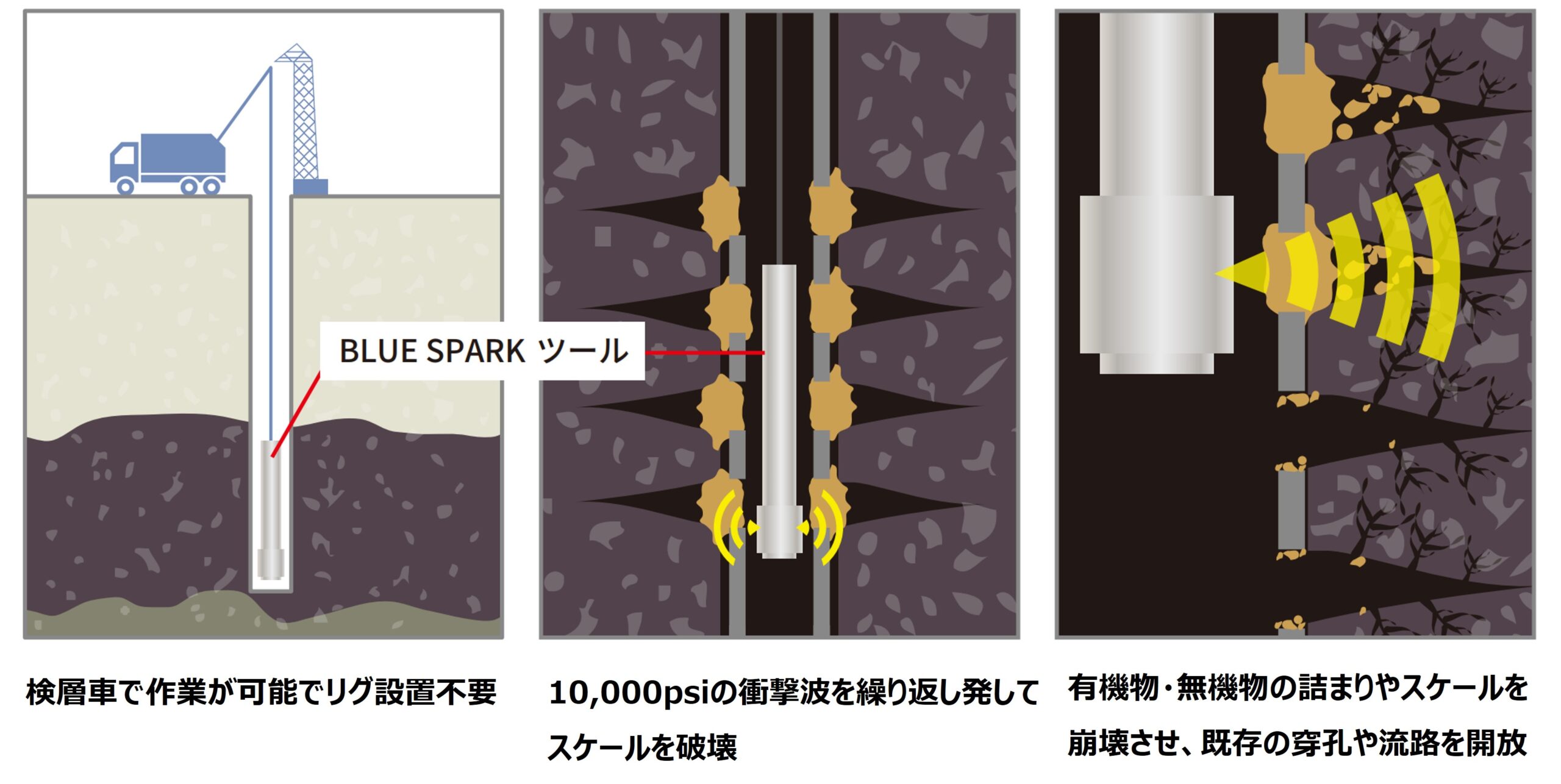 一方、BLUESPARKは掘削用にやぐらを設置することなく、限られた人員で、検層車やクレーン車といった必要最小限の設備のみを使用して、直径70ミリのデバイスの上げ下げを行って施工する。最短で1日から数日という短期間で効率的に作業を完結できるため、井戸を休止させる期間が短くなるなど経済的なメリットが大きくなる。さらに、薬液注入とは異なり、あらゆる種類のスケールの除去にも対応した点が特徴。事前準備のための浚渫を行うことなく、地層内での井戸の周囲360度方向の作業に対応する。