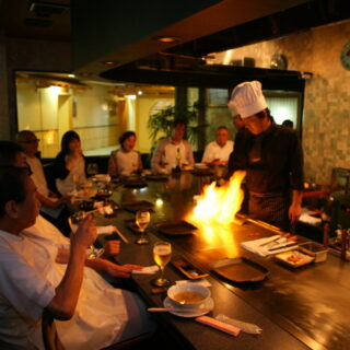千ではシェフが目の前でもてなす甲州牛・甲州ワインビーフの鉄板焼きフルコースが、昌では板前が見事な腕前で魚をさばき、新鮮な刺身と熱々の天ぷらが楽しめる。