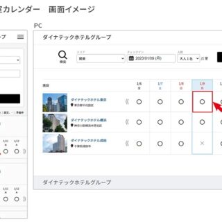 「グループ横断空室カレンダー」では、複数のグループ施設の空室状況(○×―)をカレンダー表示で比較できます。予約者様が、空室状況から日程を決めたり、決まっている日程から空いている施設を探し、カレンダーから直感的に空室を選ぶことが可能です。空室状況が分かりやすく、複数施設での比較検討がしやすいため、グループ内での予約の増加にも寄与します。