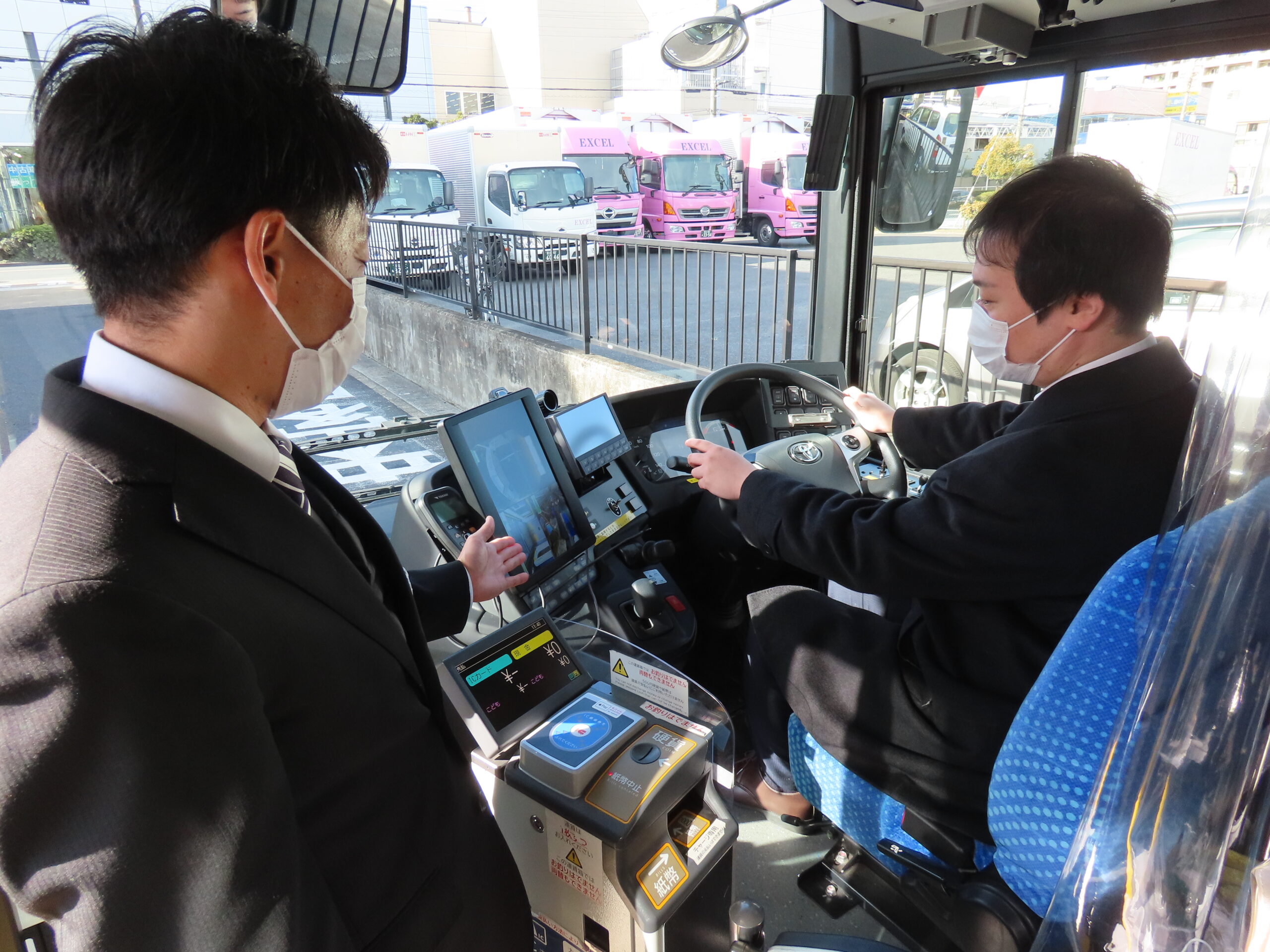 今回のバス営業所見学ツアーでは、燃料電池バス「SORA」やリフト付きスクールバスなどバス試乗体験のほか、会社説明会、現役バス運転手との座談会、点呼場見学、アルコールチェッカー体験などが行われた。