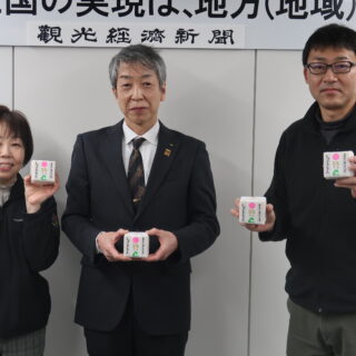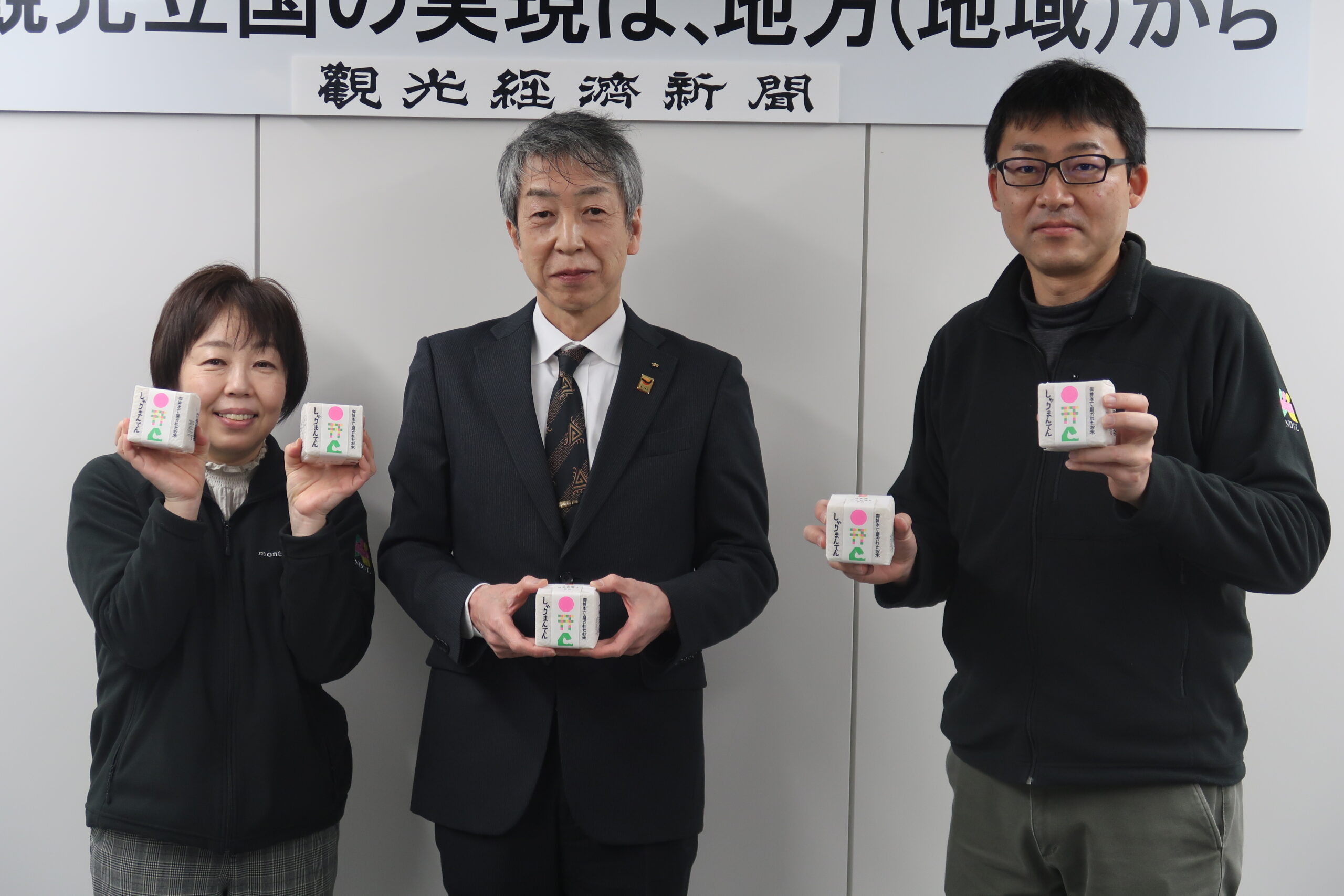 栃木県日光市の上中哲也副市長ら一行が1月25日、東京の観光経済新聞社を訪問。昨年、パッケージ(販売袋)を一新した同市のブランド米「しゃりまんてん」をPRした。