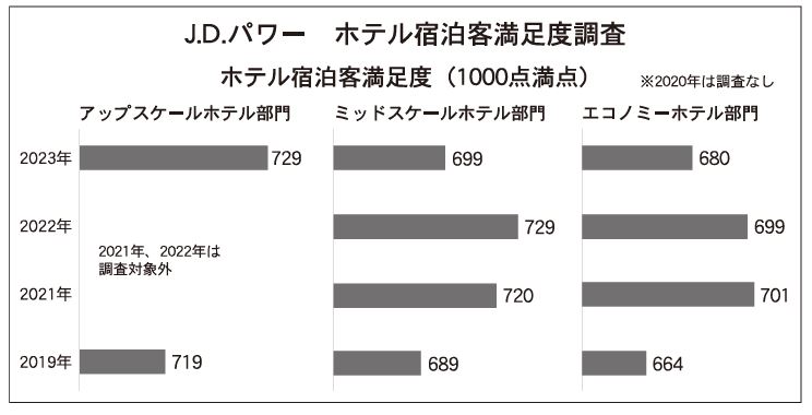 千点満点の宿泊客満足度は、ミッドスケールホテル部門が699点で22年比30ポイント減、エコノミーホテル部門が680点で19ポイント減。両部門で調査開始以来、最も高い料金水準となっており、「料金」に関する評価が大幅に下がったことで、宿泊客満足度が低下した。