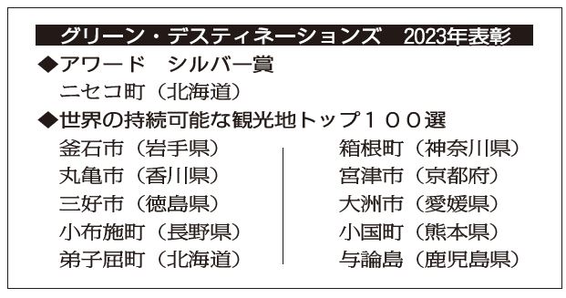 持続可能な観光の国際的な認証団体「グリーン・デスティネーションズ」(本部・オランダ)のカンファレンスがエストニア・タリンで8~10日に開かれた。「世界の持続可能な観光地トップ100選」の2023年版の表彰結果が発表され、日本からは釜石市(岩手県)など10地域が選定された。100選のさらに上位の表彰・認証制度に位置づけられているグリーン・デスティネーションズ・アワードの各賞には世界各地の13地域が選ばれ、このうちニセコ町(北海道)がシルバー賞を獲得した。