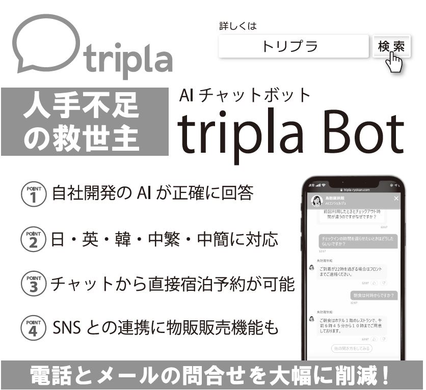 tripla(トリプラ)提供のAIチャットボット「tripla Bot」は、同社が開発したAIが自動的に回答をするサービス。特徴はAIの回答精度が利用開始から3カ月で約95%を超える点と、AIが対応できない場合は、各言語に対応したオペレーターが代わりに答える。