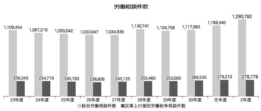 労働相談件数は年々増加傾向にある(出処=厚生労働省)=グラフ。