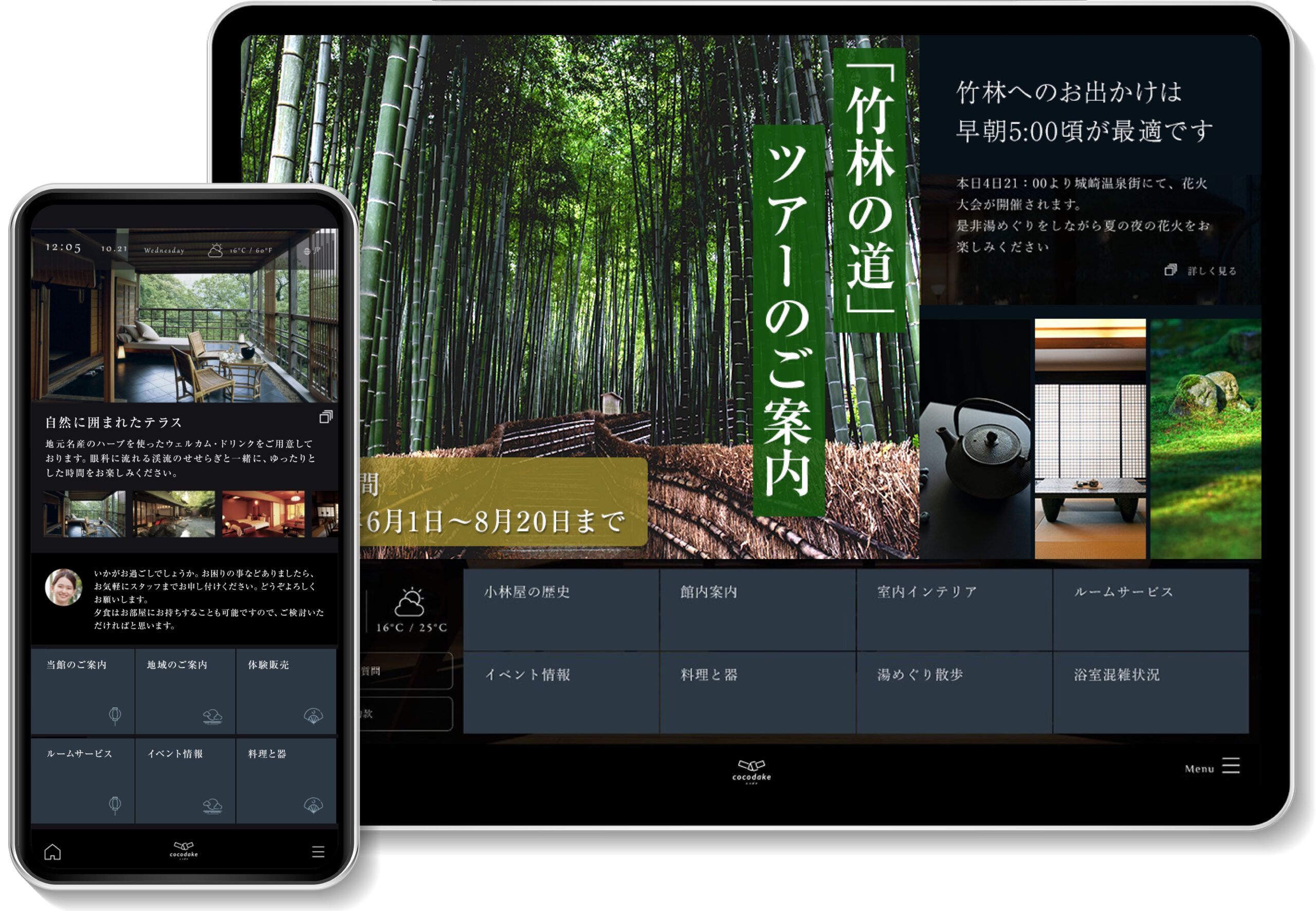 cocodakeは、「“ここだけ”でしか味わうことのできない発見や驚き、五感を揺さぶるような感動体験を届けたい」という思いを込めて、サービスの提供を開始。主な特徴として、地域・観光情報の発信、浴室利用状況を確認できる館内のインフォメーション機能を備えている。