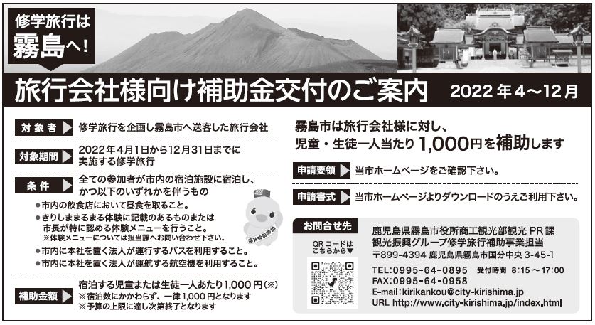 修学旅行は霧島へ! 旅行会社様向け補助金交付のご案内 2022年4~12月