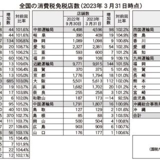 観光庁は、国税庁のデータを基に2023年3月31日時点の消費税免税店数をまとめた。全国で5万3650店となり、前回調査時(22年9月30日)に比べて1423店(2.7%)の増加となった。外国人旅行者数の伸び、免税制度の拡充で全国的に増えてきた免税店数は、コロナ禍の影響で21年3月の調査から微減の状態が続いたが、インバウンドの再開に伴って回復傾向に転じた。