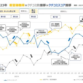 「これまで互いに反対の動きをしていた”稼働率”と”クチコミスコア”ですが、2022年10月から稼働率が上がりながらも、クチコミスコアの点数も上がってきました。訪日外国人客のクチコミが要因のひとつになっています。今月(8月)上旬に中国から日本への団体旅行が約3年半ぶりに再開されましたが、中国の不動産大手が破綻したというニュースで日本から中国への輸出や中国からの訪日観光などへの影響も少なからず出てくるものと思いますので注視していく必要があります。