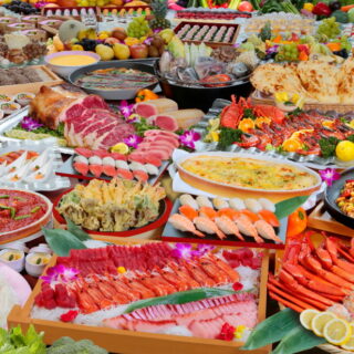夕食バイキングでは、新鮮な食材を使った寿司(すし)、ジューシーな牛の鉄板焼きなど、豊富なメニューを堪能できる。料理人が目の前で仕上げる実演バイキングも。季節ごとに食のフェアも開催され、9月5日~11月30日には「まつたけ料理と秋の味めぐり」と題して秋の味覚をお届けする。