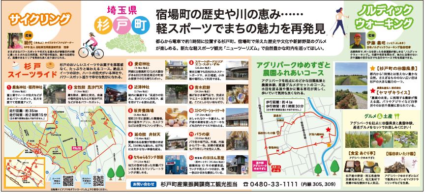 都心から電車で約1時間に位置する杉戸町。宿場町で栄えた歴史や文化や新鮮野菜のグルメが楽しめる。新たな軽スポーツ観光「ニューツーリズム」で自然豊かな町内を巡ってほしい。