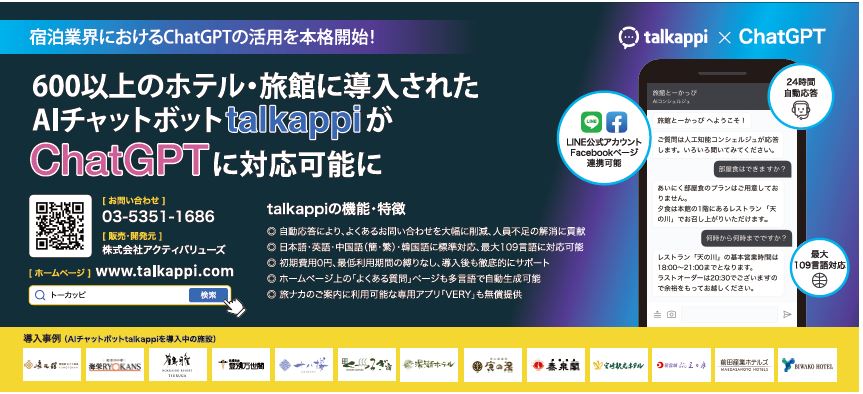 HP経由の問合せ6割削減!600以上のホテル旅館に導入!多言語AIチャットボットtalkappi、旅ナカアプリVERY